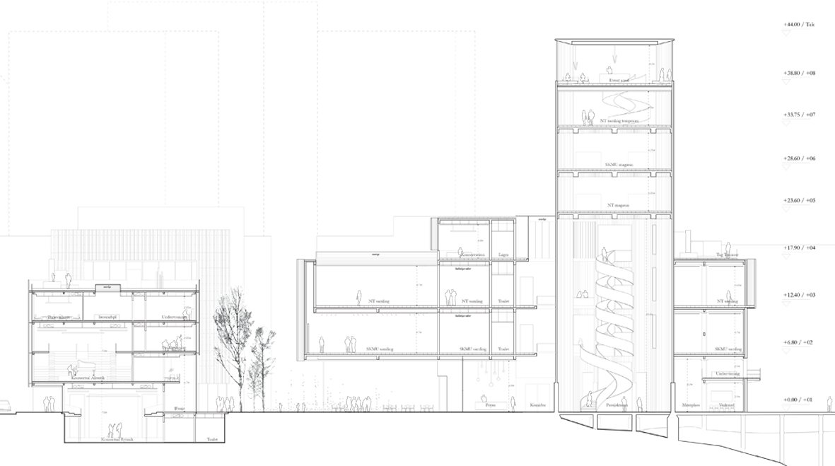 The strong significance of the existing grain silos are enhanced by a translucent volume projecting upwards and outwards with concave and convex façades. The vertical silos are embraced by a two stories horizontal gallery space, and the rooftop becomes a new viewing platform for the citizens of Kristiansand. A central installation hall is carved out inside the existing silos offering a transition zone between the various galleries.